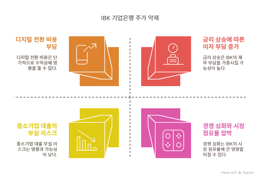 IBK기업은행은 중소기업 금융 시장에서 강점을 가지고 있지만, 다른 시중은행과 핀테크 기업의 경쟁이 심화되고 있다. 카카오뱅크, 토스뱅크 등 인터넷 전문은행은 낮은 수수료와 편리한 디지털 서비스로 중소기업 고객을 유치하며 시장 점유율을 확대하고 있다. 또한, 시중은행들은 중소기업 대출 상품 다변화와 금리 경쟁을 통해 IBK의 기존 고객층을 위협한다. 이러한 경쟁 환경은 IBK의 대출 성장률 둔화와 수익성 악화로 이어질 수 있다. 차별화된 서비스 개발과 고객 충성도 강화가 필요하지만, 이는 추가 비용과 시간을 요구한다.