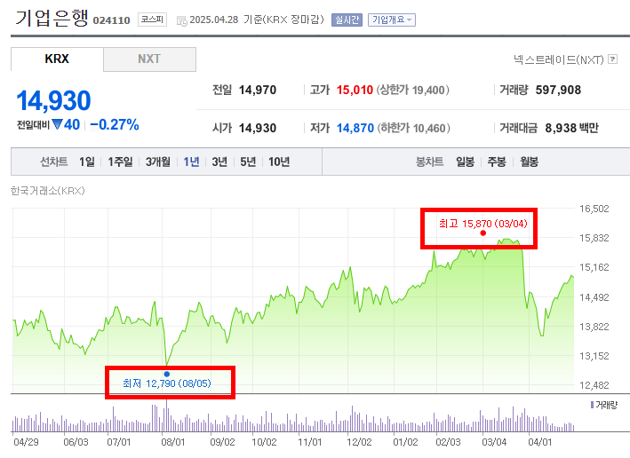2024년 8월 초 최저점을 기록한 이후, 기업은행의 주가는 안정적인 상승 추세를 이어가며 최고점을 경신했다. 뚜렷한 급등 없이 꾸준히 우상향하는 흐름을 보이며 7개월여 만에 15,870원까지 상승한 것은, 은행 산업에 대한 긍정적인 전망, 기준금리 인상 기대감, 또는 기업은행의 안정적인 실적 성장에 대한 시장의 신뢰를 반영하는 것일 수 있다. 특히 2024년 하반기 이후 경제 회복에 대한 기대감이 커지면서 은행주의 투자 매력이 높아졌을 가능성이 있다. 상승 기간 동안 거래량이 꾸준히 증가했다면, 상승 추세의 견고함을 뒷받침하는 요인으로 볼 수 있다.