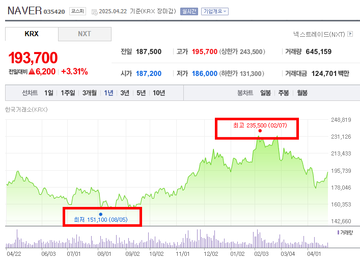 - 2025년 2월 중순부터 시작된 하락세는 4월 23일까지 지속되었다. 최고점 대비 상당 부분 하락했지만, 2024년 하반기부터 상승했던 부분을 완전히 되돌리지는 않은 채 193,700원으로 마감되었다. 따라서 전체적으로 보면 2024년 4월 23일부터 2025년 4월 23일까지의 주가 흐름은 하락 후 상승, 그리고 다시 하락하는 변동성이 큰 움직임을 나타냈다고 분석할 수 있다.