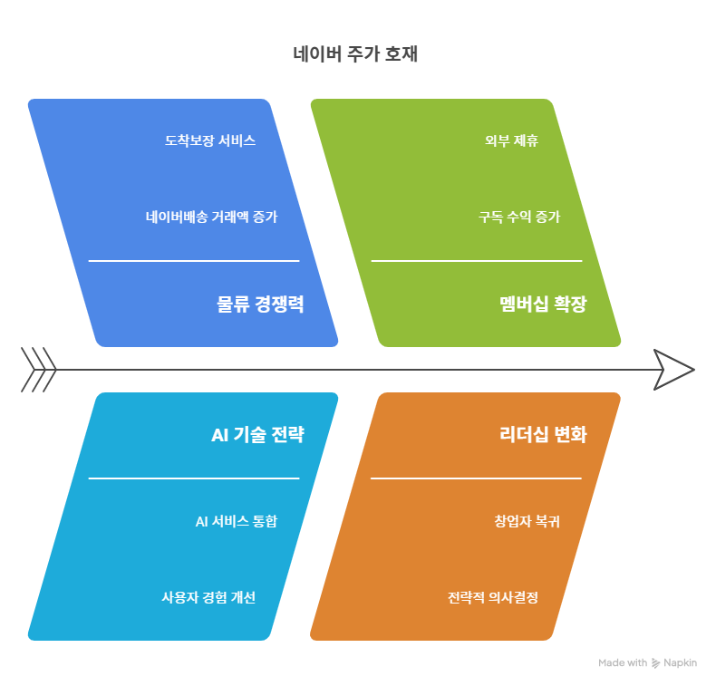 네이버는 물류회사와 연합하여 제공하는 '네이버배송' 서비스를 통해 2년 만에 거래액과 주문 건수를 3배 이상 증가시켰다. 도착보장 서비스를 통해 쿠팡의 로켓배송과 경쟁하며 성공을 거두고 있으며, 네이버플러스 멤버십을 통해 무료 배송 혜택도 제공한다. 이를 통해 물류 플랫폼으로서의 경쟁력을 강화하고 있어 직접적인 수혜가 예상된다.