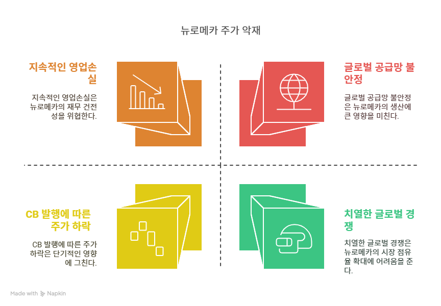 뉴로메카는 협동로봇 제조에 필요한 반도체, 센서 등 핵심 부품을 글로벌 공급망에 의존한다. 그러나 2024년 반도체 부족, 물류 비용 상승, 지정학적 갈등은 부품 수급과 생산 일정에 차질을 초래하고 있다. 이는 납품 지연과 고객 신뢰도 하락으로 이어질 수 있으며, 매출 성장에 부정적인 영향을 미친다. 특히, 중국의 원자재 수출 제한과 환율 변동은 비용 부담을 가중시킨다. 뉴로메카는 공급망 다변화를 추진하고 있지만, 단기적으로는 외부 요인에 취약한 구조를 개선하기 어렵다. 이는 운영 효율성과 재무 안정성에 리스크로 작용한다.