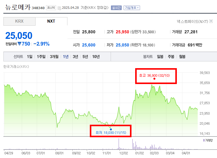 이 기간 동안 뉴로메카의 주가는 등락을 반복하면서도 전반적으로 하락하는 모습을 보였다. 2024년 4월 말 35,000원 부근에서 시작된 하락세는 7월 이후 더욱 뚜렷해지며 투자자들의 불안감을 증폭시켰을 수 있다. 11월 중순 18,030원까지 하락하며 최저점을 기록한 것은, 당시 로봇 산업에 대한 시장의 기대감이 다소 낮아졌거나, 뉴로메카 자체의 실적 부진, 또는 경쟁 심화 등의 부정적인 요인이 작용했을 가능성을 시사한다. 이 기간 동안 거래량 변화를 살펴보는 것도 중요하다. 하락 추세 속에서 거래량이 꾸준히 감소했다면, 시장의 무관심 속에 조용히 하락했을 가능성이 있다. 반대로 특정 시점에 거래량이 급증하며 하락했다면, 악재 노출에 따른 투매 현상 등을 의심해 볼 수 있다.