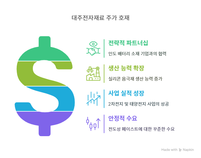 - 현재 대주전자재료는 실리콘 음극재 매출 증가(2025년 예상 매출 3,417억 원, 음극재 비중 50% 내외)와 신규 모델 수주(테슬라 모델Y 주니퍼, 현대차 아이오닉 등)로 주목받고 있으나, 배당보다는 주가 상승과 기업 가치 제고에 초점이 맞춰져 있다.