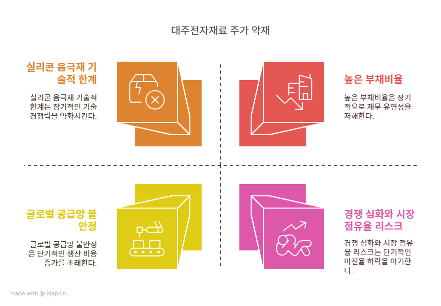 실리콘 음극재는 에너지 밀도와 충전 속도 면에서 장점이 있지만, 충·방전 과정에서 부피 팽창으로 배터리를 손상시키는 단점이 있다. 이는 실리콘 음극재 상용화의 주요 기술적 숙제로, 대주전자재료 역시 이 문제를 해결하기 위한 지속적인 R&D가 필요하다. 경쟁사들이 부피 팽창 문제를 해결한 차별화된 기술을 먼저 상용화할 경우, 대주전자재료의 시장 경쟁력이 약화될 수 있다. 또한, 기술 개발에 소요되는 시간과 비용은 단기적인 수익성에 부담을 줄 수 있다. 이러한 기술적 불확실성은 투자자들의 신뢰에 영향을 미치며, 주가 변동성을 높이는 요인으로 작용한다.