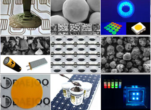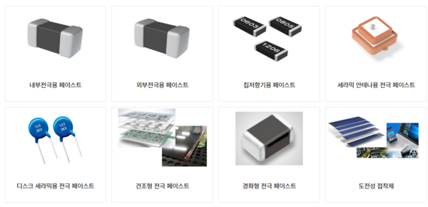 - 주력 제품은 전도성 페이스트, 태양전지용 전극재료, 이차전지용 음극재, 형광체, 고분자재료로, 스마트폰, 노트북, 전기차 등에 사용되는 칩부품(MLCC, 칩저항기, 칩인덕터)과 태양전지, 이차전지에 적용된다.