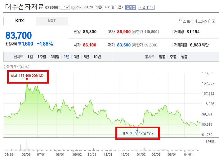 이 기간 동안 주가는 매우 가파르게 상승하며 최고점을 경신했다. 2024년 4월 말부터 상승세가 시작되어 5월에는 더욱 탄력을 받고 급등하는 모습을 보였다. 특히 5월 중순 이후 상승폭이 더욱 커지면서 투자자들의 높은 기대감을 반영했다. 6월 초까지 상승세가 이어져 163,400원의 최고점을 기록한 것으로 보아, 이 시기에는 대주전자재료에 대한 긍정적인 전망이나 구체적인 호재가 시장에 강하게 작용했을 가능성이 크다. 예를 들어, 전고체 배터리 관련 기술 개발 진전, 주요 고객사와의 대규모 공급 계약 체결, 또는 실적 개선에 대한 기대감 등이 주가 상승을 이끌었을 수 있다. 급등 기간 동안 거래량이 꾸준히 증가했다면, 상승 추세가 더욱 강력했음을 시사한다.