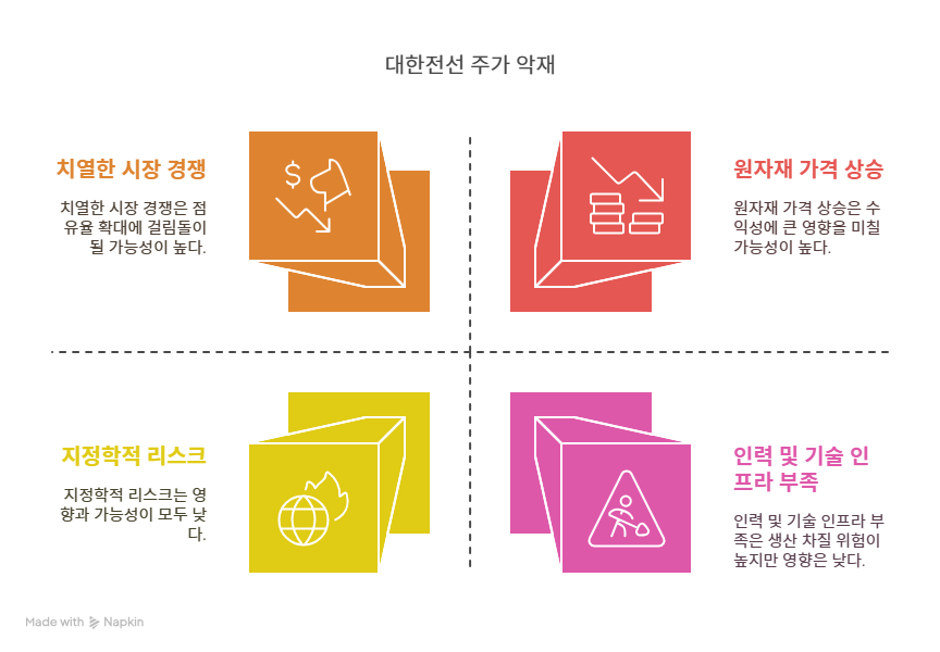 미국과 중국 간 무역 갈등 및 트럼프 행정부의 관세 정책 강화는 대한전선의 해외 수주와 공급망에 불확실성을 더한다. 특히, 미국 시장에서의 보호무역주의 강화는 추가 비용 부담과 수주 감소 위험을 초래할 수 있다. 중동 및 유럽 지역의 정치적 불안정도 프로젝트 지연 가능성을 높인다.