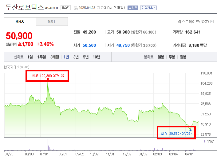 • 4월 초 최저점 이후에는 소폭 반등하여 4월 24일 종가는 5만 900원으로 마감되었다. 이는 단기적인 기술적 반등일 수 있으며, 향후 주가 흐름은 로봇 산업의 성장성과 두산로보틱스의 실적에 따라 달라질 수 있을 것이다.
