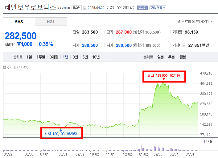 - 하지만 2월 최고점을 기록한 이후에는 점차 하락세로 전환되어 4월 22일 현재 282,500원으로 마감되었다. 이는 급격한 상승에 대한 차익 실현 매물 출회나 시장 상황 변화 등의 요인으로 해석될 수 있다.