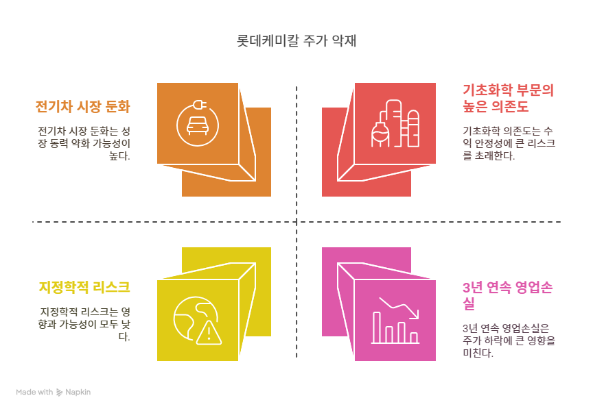 롯데케미칼의 매출 60% 이상이 기초화학 부문에서 발생하며, 이는 글로벌 유가와 중국의 설비 증설에 크게 좌우된다. 중국의 석유화학 산업 확대는 수출 물량 감소와 글로벌 경쟁 심화로 이어졌다. 2024년 기초화학 부문은 매출 3조 3,078억 원, 영업손실 1,750억 원을 기록하며 실적 부진의 주요 원인으로 작용했다. 중국 제품과의 가격 경쟁은 제품 스프레드를 축소하며 수익성을 악화시켰다. 고부가 제품으로의 전환을 추진 중이나, 기초화학 의존도가 단기적으로 해소되기 어렵다. 이는 롯데케미칼의 수익 안정성에 리스크로 작용한다.