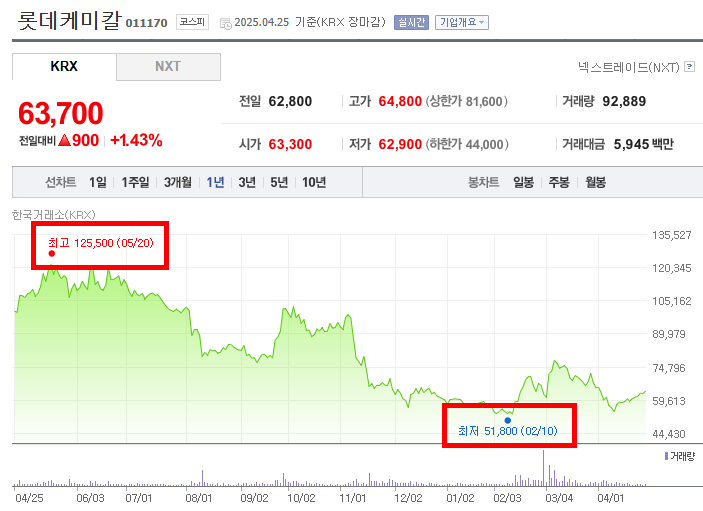 최고점인 125,500원에서 최저점인 51,800원까지 장기간에 걸쳐 급격하게 하락한 구간이다. 여러 차례의 반등 시도가 있었으나, 추세를 되돌리지 못하고 지속적인 하락세를 나타냈다. 특히 2024년 하반기에는 글로벌 경기 둔화 심화, 화학 제품 수요 부진, 중국 시장의 경쟁 심화 등의 악재가 겹치면서 하락폭이 더욱 확대되었다. 거래량도 하락하는 과정에서 등락을 반복하며 투자자들의 불안감을 반영했다.