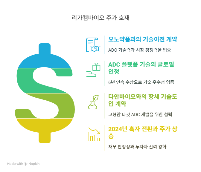 - 배당 전망: 리가켐바이오의 현재 재무 전략과 바이오산업의 특성을 고려할 때, 2025년 내 배당금 지급 가능성은 낮다. 다만, 지속적인 기술이전 계약(예: 얀센, 오노약품)과 임상 시험 성공으로 안정적인 수익이 확보된다면, 장기적으로 배당 정책 도입을 검토할 여지가 있다. 현재는 주주 가치 제고를 위해 주가 상승과 기업 가치 증대에 집중하고 있다.