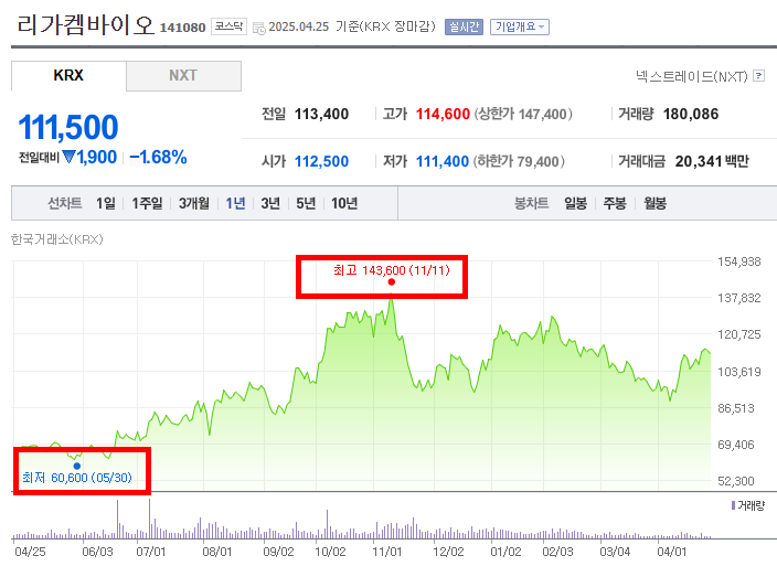 가장 가파른 상승세를 보인 구간이다. 9만원대 초반에서 시작하여 11월 중순에는 최고점인 143,600원까지 급등했다. 특히 10월부터 거래량이 크게 증가하며 상승에 힘을 실었다. 이 기간 동안 임상 시험의 긍정적인 결과 발표, 기술 이전 계약 체결 임박, 또는 해외 시장 진출 기대감 등 구체적인 호재가 작용했을 가능성이 매우 높다. 투자자들의 높은 기대감이 주가에 적극적으로 반영된 것으로 해석할 수 있다.