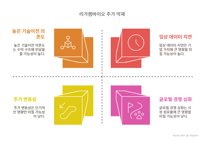 리가켐바이오의 주요 파이프라인인 LCB84, LCB14, LCB71은 각각 임상 1/2상, 1a상, 1a/1b상 진행 중이다. LCB84의 임상 데이터는 2025년 발표 예정이며, LCB14의 1b상 결과는 2025년 하반기 예상된다. 그러나 임상 데이터 지연이나 기대 이하의 결과는 기술이전 마일스톤 수령과 기업 가치에 부정적인 영향을 미칠 수 있다. 특히, 글로벌 ADC 시장의 경쟁 심화로 임상 성공의 중요성이 커진 상황에서, 데이터 공개 지연은 투자 심리에 악재로 작용할 가능성이 있다.