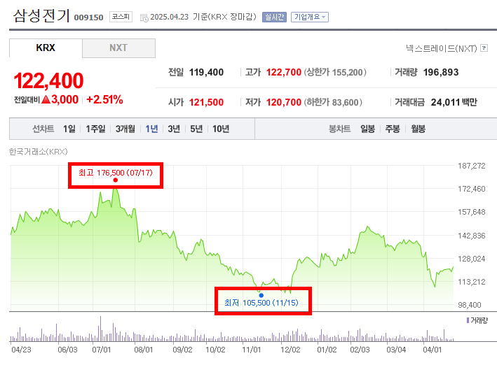 - 11월 중순 이후부터 2025년 4월까지 주가는 다시 상승과 하락을 반복하며 등락을 거듭하는 모습을 보였다. 뚜렷한 상승 추세나 하락 추세보다는 특정 가격대에서 지지 또는 저항을 받는 움직임을 보였다. 2025년 4월 23일 종가는 12만 2,400원으로, 1년 전 주가 대비 소폭 상승한 수준으로 마감되었다.