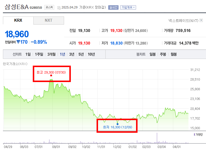 뚜렷한 상승 구간은 기간 초인 2024년 5월부터 7월 말까지 나타난다. 이 기간 동안 주가는 꾸준히 상승하여 7월 30일에 최고점인 29,300원을 기록한다. 또한, 기간 말인 2025년 2월 말부터 4월 30일까지 완만한 상승세가 나타난다. 이 구간에서 주가는 2024년 12월 9일 최저점인 16,300원 부근에서 소폭 상승하는 모습을 보인다.