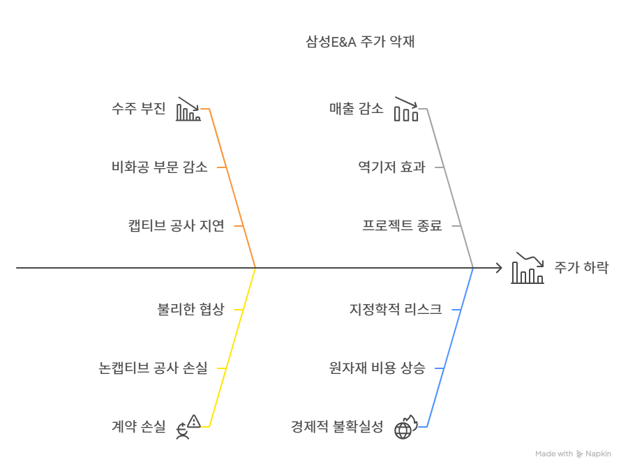 삼성E&A는 글로벌 경제 불확실성과 원자재 비용 상승으로 비용 부담이 증가하고 있다. 2024년 화학 원료와 철강 가격이 15~20% 상승했으며, 공급망 불안정으로 자재 수급이 지연되고 있다. 이는 프로젝트 원가 상승으로 이어져 이익률을 압박한다. 또한, 중동 지역의 지정학적 리스크와 글로벌 금리 인상은 해외 프로젝트 수주와 자금 조달에 불확실성을 더한다. 삼성E&A는 철저한 프로젝트 관리로 대응 중이나, 단기적인 비용 부담은 실적에 부정적 영향을 미칠 가능성이 크다.