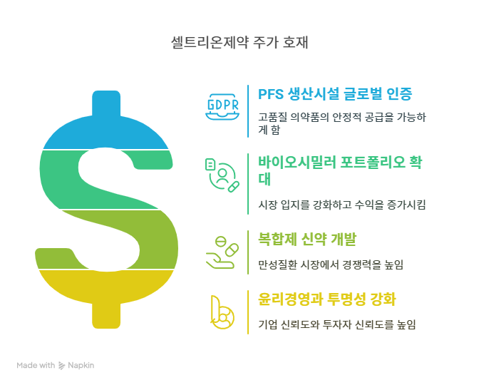 셀트리온제약은 2023년 청주공장 PFS(프리필드시린지) 생산라인에 대해 미국 FDA cGMP 인증을 획득했다. 이는 유럽, 브라질, 일본 등 주요 규제기관의 GMP 인증에 이어 글로벌 제조 경쟁력을 입증한 성과다. 바이오타임즈에 따르면, 이번 인증으로 고품질 PFS 제형 의약품의 안정적 공급이 가능해지며, 특히 북미 시장 진출이 가속화된다. PFS는 안전성과 편의성으로 수요가 증가하는 추세이며, 펜과 안전장치 타입을 동시에 생산할 수 있는 청주공장의 역량은 시장 확대에 기여한다. 이는 매출 다각화와 글로벌 시장 점유율 확대의 주요 동력으로 작용한다.