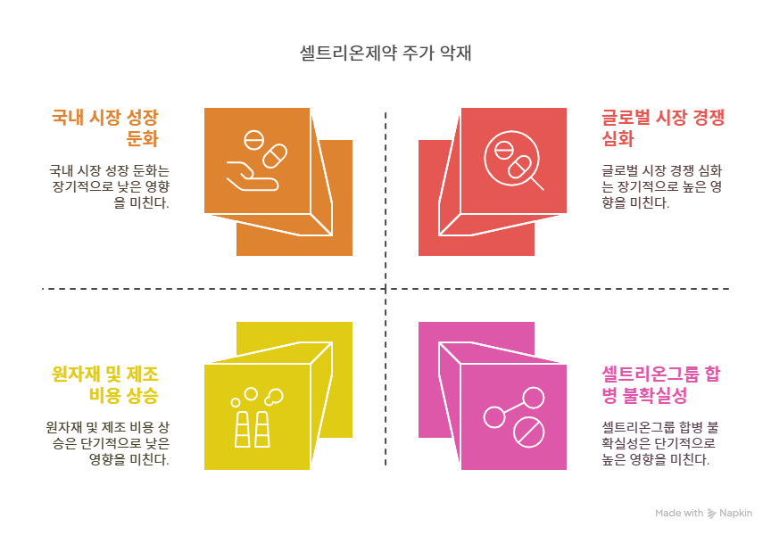 2024년 셀트리온과 셀트리온제약의 합병 타당성 검토 소식이 전해지며 주가가 하락했다. 히트뉴스에 따르면, 7월 31일부터 8월 2일까지 셀트리온제약 주가는 8.91% 하락했다. 소액주주연대의 합병 반대와 주주가치 훼손 우려로 반대 매수청구권 행사 가능성이 제기되며 합병 무산 리스크가 커졌다. 이는 단기적으로 주가 변동성을 확대하고, 투자자 신뢰에 부정적 영향을 미친다. 합병이 성공하더라도 지배구조 변화와 비용 증가가 수익성에 영향을 줄 가능성이 크다.