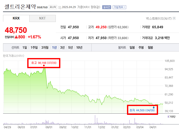 주된 하락 구간은 최고점을 기록한 직후인 2024년 7월 말부터 2025년 4월 초까지 지속적으로 나타난다. 특히 2024년 8월에는 주가가 급격하게 하락하는 모습을 보이며, 이후에도 뚜렷한 반등 없이 하락세를 이어간다. 2025년 2월과 3월에도 소폭의 등락은 있지만, 전체적으로 하락 추세에서 벗어나지 못하는 모습이다. 2025년 4월 9일에는 최저점인 44,500원을 기록한다.