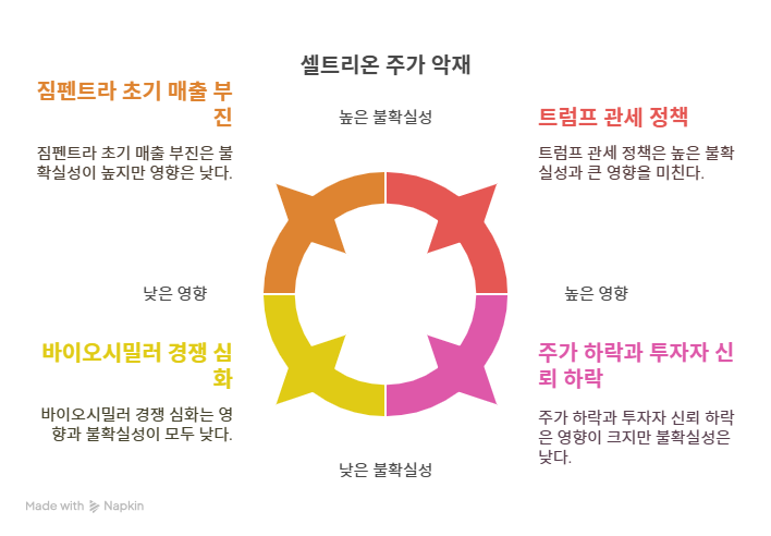 미국 트럼프 2기 정부의 관세 정책은 셀트리온에게 리스크 요인으로 작용하고 있다. 트럼프 대통령은 취임 직후 외국에서 생산된 의약품에 관세를 부과할 가능성을 언급했다. 이에 셀트리온은 3단계 대응 전략을 마련했으나, 관세 부과 시 원가 상승과 수익성 하락이 불가피할 것으로 예상된다. 셀트리온은 2025년 미국에서 판매 예정인 제품에 대해 약 9개월 분의 재고 이전을 완료했으며, 장기적으로는 미국 현지 생산기지 설립을 검토하고 있으나, 관세 정책의 불확실성은 여전히 기업 전략에 부담으로 작용하고 있다.