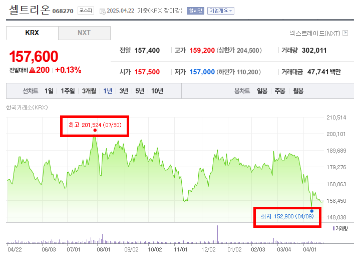 • 2025년 1월 이후 다시 상승하는 듯한 움직임을 보였으나, 이전 최고점 근처에서 저항을 받고 다시 하락세로 전환되었다. 이 하락세는 지속되어 2025년 4월 9일에 최저점인 152,900원을 기록했다. 최저점을 기록한 이후에는 소폭 반등하여 4월 22일 현재 157,600원으로 마감되었다.