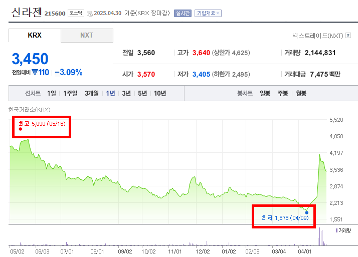 - 요약하자면, 해당 기간 동안 신라젠의 주가는 전반적으로 하락하는 추세를 보였으나, 중간에 급격한 상승 구간도 두 번 나타났다. 2024년 5월 중순 최고점 이후 큰 폭으로 하락했으며, 2024년 말 잠시 급등했다가 다시 하락하여 2025년 4월 초 최저점을 기록한 후 매우 강하게 반등하는 극심한 변동성을 보이는 종목이라고 분석할 수 있다.