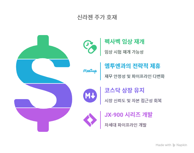 신라젠은 2021년 엠투엔과의 600억 원 규모 제3자배정 계약을 체결한 이후, 2024년 추가 협력을 통해 재무 안정성을 강화했다. 엠투엔의 자회사 그린파이어바이오와의 신약 개발 협력은 신라젠의 파이프라인 다변화에 기여한다. 2024년 잡코리아 기업 정보에 따르면, 엠투엔의 자금력과 네트워크는 신라젠의 R&D 자금 조달과 글로벌 시장 진출을 지원한다. 2025년에는 그린파이어바이오와의 공동 임상 프로젝트가 가시화될 가능성이 크며, 이는 신라젠의 기술 수출과 매출 증대에 긍정적인 영향을 미친다. 이러한 전략적 제휴는 신라젠의 장기적인 성장 기반을 마련한다.
