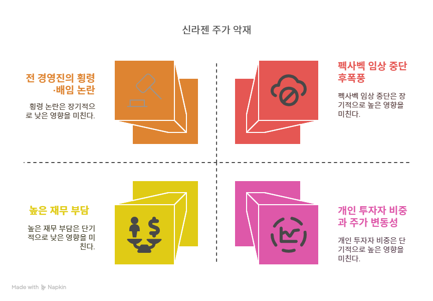신라젠은 2020년 문은상 전 대표 등의 횡령·배임 혐의로 거래 정지에 직면했다. 문 전 대표는 2심에서 징역 5년과 벌금 10억 원을 선고받았으며, 2024년 대법원의 원심 파기로 재판이 진행 중이다. 이 사건은 신라젠의 지배구조와 투명성에 대한 시장의 신뢰를 훼손했다. 2025년에도 법적 분쟁이 지속될 경우, 기업 이미지 악화와 투자자 이탈이 우려된다. 또한, 추가적인 법적 비용과 배상 책임은 재무 부담을 가중시키며, 신라젠의 자금 운용에 제약을 가한다.