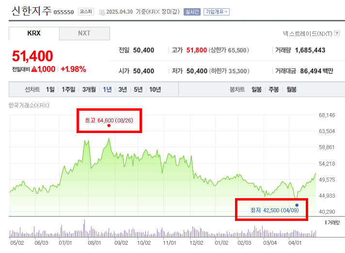 - 반면, 주가가 하락한 주요 구간은 2024년 8월 말 이후부터 2025년 1월 말까지이다. 8월 26일 최고가를 기록한 이후 주가는 지속적으로 하락하여 2025년 4월 9일에는 최저가인 42,500원까지 떨어졌다. 이는 약 5개월 동안 상당한 폭의 주가 하락이 있었음을 보여준다. 이후 소폭의 등락을 반복하다가 다시 상승세로 전환되었다.
