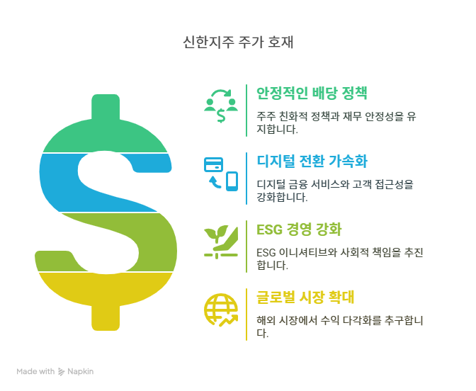 - 또한, 디지털 금융과 ESG(환경, 사회, 지배구조) 경영을 사업 모델에 적극 통합한다. 모바일 뱅킹 플랫폼과 AI 기반 금융 서비스를 통해 고객 경험을 개선하고, ESG 투자 상품 개발로 지속 가능한 성장에 기여한다. 이러한 다각화와 혁신은 신한지주가 시장 변동성에도 안정적인 실적을 유지할 수 있는 핵심 요인이다.