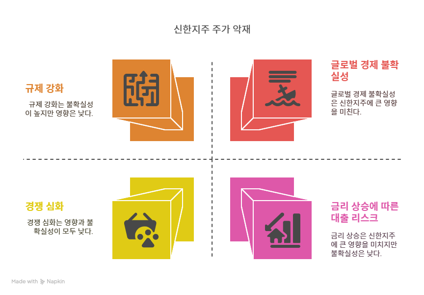 글로벌 경제 불확실성은 신한지주의 해외 사업에 악재로 작용한다. 2025년 세계 경제는 지정학적 리스크와 주요국 금리 인상으로 변동성이 커지고 있다. 신한지주의 해외 법인, 특히 아시아 지역 사업은 환율 변동과 현지 경제 상황에 민감하다. 예를 들어, 베트남의 인플레이션과 부동산 시장 불안은 현지 수익성에 영향을 미칠 수 있다. 또한, 글로벌 공급망 위기와 에너지 가격 상승은 기업 대출의 리스크를 높인다. 신한지주는 글로벌 포트폴리오 다각화로 리스크를 완화하고 있지만, 외부 환경의 불확실성은 여전히 주요 악재다.