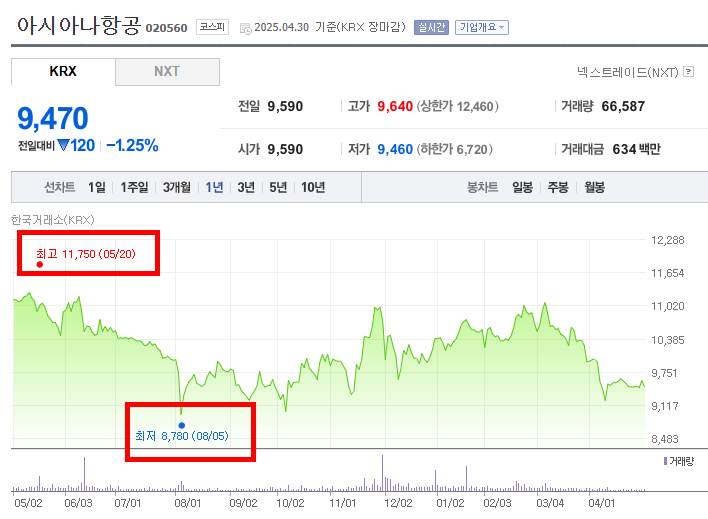 - 결론적으로, 해당 기간 동안 아시아나항공의 주가는 초기 급격한 하락 이후 상승과 하락을 반복하는 변동성을 나타냈다. 2024년 여름부터 가을까지 상승하는 모습을 보였으나, 연말과 2025년 초 다시 하락하는 경향을 보였다. 이후 일시적인 반등이 있었지만, 최종적으로는 하락한 채로 기간을 마감했다.