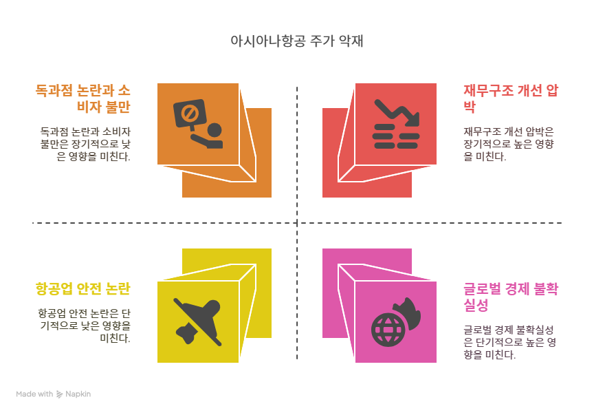 최근 제주항공 사고로 항공업계의 안전 문제가 부각되며 아シア나항공에도 간접적인 악재로 작용한다. 2025년 1월 10일 한겨레 보도에 따르면, 제주항공 참사로 안전에 대한 소비자 우려가 커졌다. 아시아나항공은 직접적인 사고와 무관하지만, 업계 전반의 신뢰 하락은 고객 수요 감소로 이어질 수 있다. 또한, 안전 강화를 위한 추가 투자와 규제 준수 비용은 재무 부담을 가중시킨다. 이는 아시아나항공의 운영 비용 증가와 수익성 악화로 연결될 가능성이 높다.