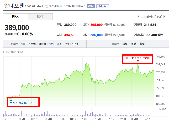 - 5월 중순 최저점을 기록한 이후 주가는 급격하게 상승하는 추세를 보였다. 2025년 3월 18일에는 최고점인 45만 9,500원까지 상승하며 1년도 채 되지 않는 기간 동안 매우 높은 상승률을 기록했다. 이는 알테오젠의 플랫폼 기술에 대한 기대감 증폭, 글로벌 제약사와의 협력 가능성, 또는 긍정적인 임상 데이터 발표 등 다양한 호재들이 복합적으로 작용한 결과로 보인다.
