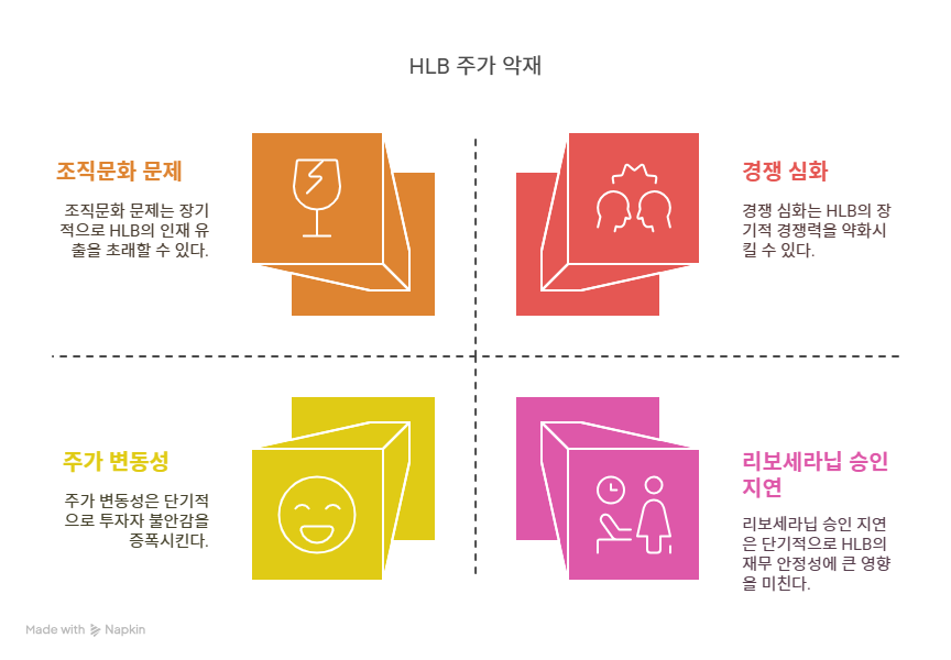 리보세라닙의 FDA 승인은 HLB의 핵심 성장 동력이나, 승인 지연 가능성은 주요 악재로 꼽힌다. 2024년 초 FDA는 추가 자료를 요청하며 심사를 연기한 바 있다. 2025년 상반기 최종 결정이 예정돼 있으나, 임상 데이터의 복잡성과 경쟁 약물의 시장 진입으로 심사가 까다로워질 수 있다. 실패 시 HLB의 매출 전망과 주가에 큰 타격이 예상된다. 증권가는 승인 확률을 70%로 평가하지만, 불확실성은 여전히 존재한다. 이는 HLB의 단기적인 재무 안정성에 영향을 미칠 수 있다.
