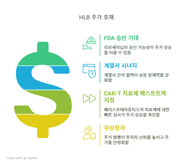 HLB의 미국 계열사 베리스모테라퓨틱스는 차세대 CAR-T 치료제 ‘SynKIR-110’이 2023년 FDA로부터 패스트트랙 지정을 받았다. 이 치료제는 고형암 타깃으로, 미충족 의료수요가 높은 분야에서 기존 치료제 대비 우수한 효능을 기대받는다. 패스트트랙 지정은 임상 심사 과정을 가속화하며, 2025년 1상 임상 데이터 발표가 예정돼 있다. 성공 시 HLB의 바이오 파이프라인 다각화와 글로벌 시장 확대에 기여할 전망이다. 증권가는 이를 계기로 HLB이노베이션 주가가 급등한 사례를 언급하며, HLB의 기술력과 계열사 시너지가 긍정적인 영향을 미친다고 평가한다. 이는 HLB의 성장 동력을 강화한다.