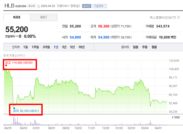 7만원대 초반에서 5만원대 초반까지 지속적으로 하락하는 장기적인 하락 추세 구간이다. 중간중간 짧은 반등이 있었으나, 전반적인 하락 흐름을 되돌리지는 못했다. 이 기간 동안 제약/바이오 업종 전반의 투자 심리 위축, 경쟁사들의 성과 부진, 또는 HLB 자체의 임상 진행에 대한 우려 등이 복합적으로 작용했을 수 있다. 거래량은 하락 추세 속에서 등락을 반복하는 모습이다.