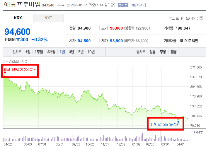 - 최저점을 기록한 이후에는 소폭 상승하는 움직임을 보이며 2025년 4월 22일에는 94,600원으로 마감되었다. 하지만 이는 최고점 대비 여전히 낮은 수준이다.
