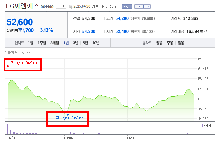 - 이후 주가는 상승과 하락을 반복하는 변동성을 보인다. 3월 중순까지 소폭 반등하는 듯했으나 다시 하락하여 4월 초까지 50,000원 부근에서 등락을 거듭한다. 4월 중순 이후부터는 완만한 상승세를 보이며 4월 30일에는 52,600원으로 마감한다. 이 상승 구간에서는 거래량이 이전 기간에 비해 다소 증가하는 모습이 관찰된다.