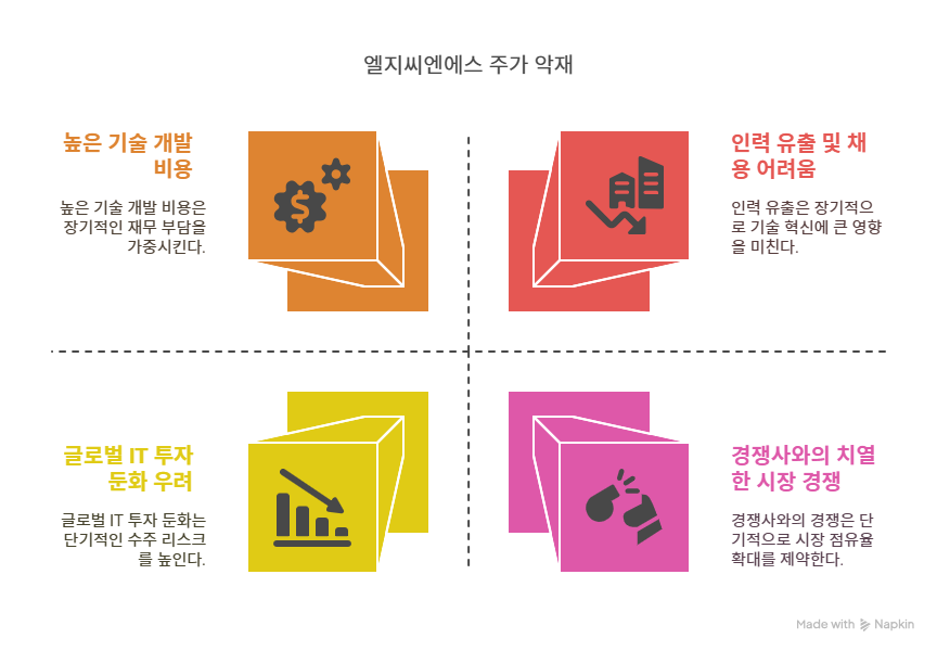 엘지씨엔에스는 삼성SDS, SK C&C 등 국내 IT 서비스 기업 및 글로벌 기업(IBM, Accenture)과의 경쟁이 심화되고 있다. 특히 AI와 클라우드 시장에서 글로벌 기업들의 공격적인 가격 경쟁과 기술 혁신이 엘지씨엔에스의 시장 점유율 확대를 제약하고 있다. 2025년 1분기 클라우드 사업 매출이 크게 성장했으나, 아마존 AWS, 마이크로소프트 Azure의 시장 지배력이 강화되며 수주 경쟁이 치열해졌다. 또한, 국내 금융 및 공공 부문에서 삼성SDS의 적극적인 사업 확장이 엘지씨엔에스의 수주 기회에 영향을 미치고 있다. 이는 중장기적으로 매출 성장에 제약을 가할 수 있다.