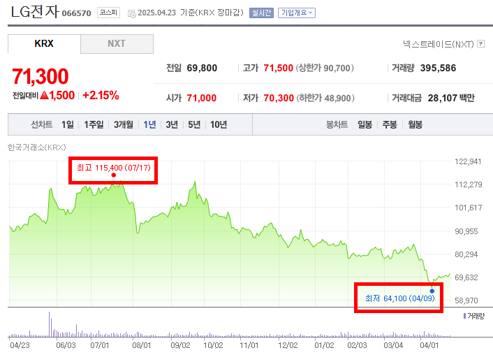 - 하지만 7월 중순 이후 주가는 하락세로 전환되어 2025년 4월 초까지 지속적으로 하락하는 추세를 보였다. 중간에 일시적인 반등도 있었으나, 전반적으로 하향 곡선을 그렸다. 특히 2025년 4월 9일에는 최저점인 6만 4,100원까지 하락하며 큰 폭의 하락세를 경험했다. 이 시기에는 글로벌 경기 둔화 우려나 전자 산업 전반의 부진, 또는 LG전자 특정 사업 부문의 실적 악화 등이 영향을 미쳤을 가능성을 생각해 볼 수 있다.