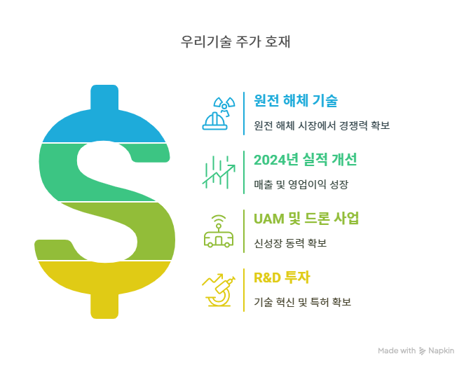 우리기술은 2024년 R&D에 150억 원을 투자하며 원자력, 방산, 드론 관련 기술 개발을 가속화했다. 이를 통해 50건의 신규 특허를 확보하며 총 300건 이상의 특허 포트폴리오를 구축했다. 특히, 원전 해체용 로봇과 방산용 센서 기술은 글로벌 경쟁력을 인정받아 해외 수출 논의가 진행 중이다. 2025년에는 정부의 12대 국가전략기술 육성 계획에 따라 AI 기반 원전 관리 시스템 개발에 100억 원을 추가 투자할 계획이다. 이러한 R&D 투자는 기술 혁신과 신규 시장 진출을 뒷받침하며, 우리기술의 장기적인 성장 동력을 강화한다.