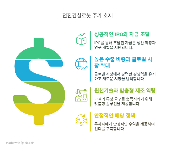 전진건설로봇은 상장 후 안정적인 배당 정책을 약속했다. 2024년 8월 붉은말 블로그에 따르면, 최대주주 모트렉스(주)는 2018년부터 평균 99.7%의 배당성향을 유지했으며, 상장 후 3년간 최소 50% 배당성향을 확약했다. 이는 한국거래소 상장예비심사 조건으로, 투자자들에게 안정적인 수익을 보장한다. 높은 배당성향은 주주 친화적 정책으로 평가되며, 장기 투자자를 유인한다. 또한 안정적인 배당은 기업의 재무 건전성과 지속 가능한 성장 가능성을 시장에 알리는 신호로 작용한다. 이는 주가 안정성과 투자자 신뢰를 높이며, 자본시장에서의 신뢰도를 강화하는 호재로 평가된다.