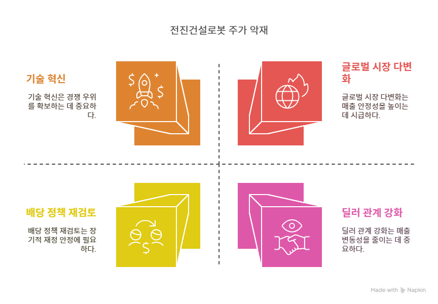 전진건설로봇은 CPC 시장에서 국내 1위지만, 글로벌 경쟁 심화는 악재로 작용한다. 글로벌 CPC 제조업체인 푸츠마이스터(Putzmeister), 쉬윙(Schwing) 등은 자본력과 기술력으로 시장을 선점하고 있다. 2024년 시장 보고서에 따르면, 경쟁사들은 친환경 전기 CPC와 자동화 기술로 차별화를 시도하며, 전진건설로봇은 이에 대응하기 위한 기술 개발 비용이 증가한다. 또한 국내 중소기업의 저가 경쟁은 가격 하락 압박으로 이어진다. 기술적 도전으로는 고층빌딩용 초고압 CPC 개발과 친환경 장비로의 전환이 요구되며, 실패 시 시장 점유율 감소 위험이 있다. 이러한 경쟁과 기술적 부담은 수익성과 성장에 악재로 작용한다.