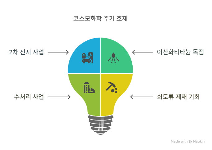 - 코스모화학은 이산화티타늄(TiO₂) 제조를 핵심 사업으로 하며, 2차전지 소재와 친환경 소재 분야로 사업을 확장하고 있다.