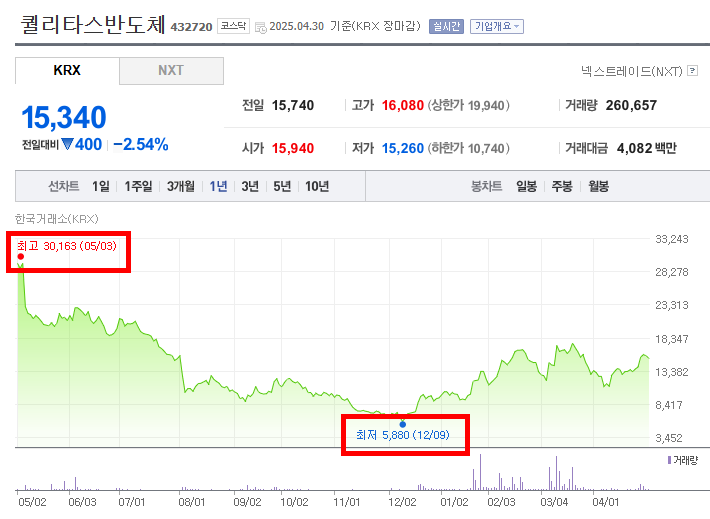 - 결론적으로, 해당 기간 동안 퀄리타스반도체의 주가는 초기 급격한 하락 이후 뚜렷한 반등을 보이는 변동성이 큰 흐름을 나타냈다. 2024년 상반기에는 지속적인 하락세를 보였으나, 연말부터 강한 상승세로 전환되어 상당 부분 하락폭을 만회했다. 하지만 2025년 3월 이후 다시 하락하는 모습을 보이며 불안정한 주가 흐름을 나타내고 있다.