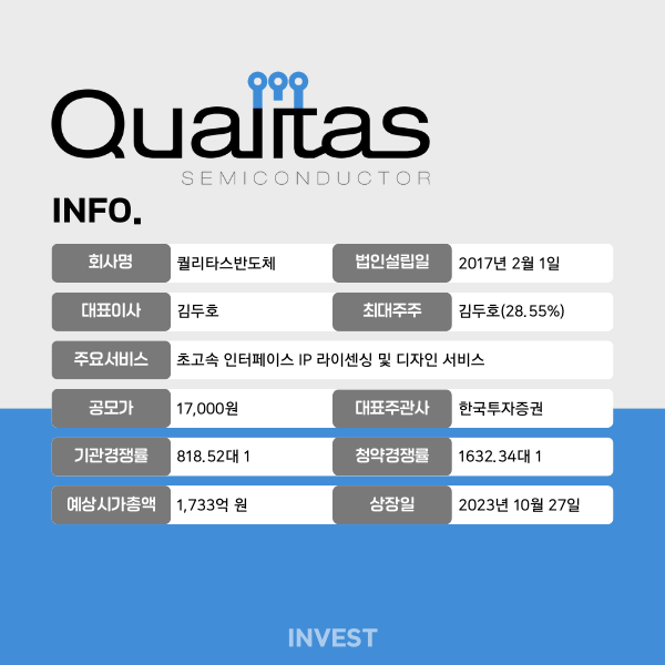 - 퀄리타스반도체는 초고속 인터커넥트 기술을 선도하는 팹리스 반도체 기업으로, 인공지능(AI), 자율주행, 데이터센터, 모바일, 디스플레이 등 고성능 데이터 연산이 필요한 분야에 특화된 솔루션을 제공한다. 2017년 삼성전자 출신 전문가들이 설립한 이 회사는 초고속 인터페이스 IP(지적재산권) 라이센싱과 디자인 서비스를 핵심 사업으로 영위한다.