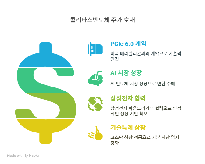 퀄리타스반도체는 AI 반도체 시장의 성장으로 수혜를 받고 있다. 2025년 2월 9일 핀포인트뉴스에 따르면, 이재용 삼성전자 회장, 샘 올트먼 OpenAI CEO, 손정의 소프트뱅크 회장의 AI 반도체 협력 논의가 퀄리타스반도체에 대한 기대감을 키웠다. 퀄리타스반도체는 AI 연산에 필수적인 초고속 인터커넥트 IP를 제공하며, 삼성전자 파운드리 생태계의 핵심 파트너로 자리 잡았다. 특히, AI 칩렛과 고속 인터페이스 기술은 빅테크 기업의 자체 반도체 설계 수요 증가와 맞물려 매출 성장으로 이어진다. 이러한 시장 트렌드는 퀄리타스반도체의 기술 포트폴리오와 부합하며, 장기적인 수익성을 강화하는 호재로 작용한다.