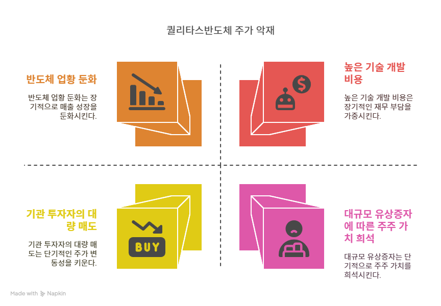 퀄리타스반도체는 초고속 인터커넥트 IP 개발에 높은 비용을 투자하며 재무 부담을 안고 있다. 2023년 5월 25일 디일렉 보도에 따르면, 퀄리타스반도체는 칩렛 인터페이스와 PCIe 6.0 IP 개발에 집중하고 있지만, 이러한 고난도 기술은 개발 비용과 시간이 많이 소요된다. 또한, 글로벌 경쟁사인 시놉시스와 케이던스에 비해 자본력이 부족한 퀄리타스반도체는 R&D 투자와 수익성 사이에서 균형을 맞추기 어렵다. 유상증자로 자금을 조달했으나, 지속적인 고비용 구조는 단기적인 수익성에 부담을 준다. 이는 퀄리타스반도체의 재무 안정성과 성장 속도에 잠재적인 악재로 작용한다.